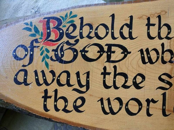 Beautiful vintage wooden wall plaque featuring the beloved biblical verse from John 1:29: "Behold the Lamb of God which taketh away the sin of the world." This charming piece measures 26" x 8.5" and showcases hand-painted lettering on natural wood with the original bark edges preserved, giving it an authentic rustic appeal.