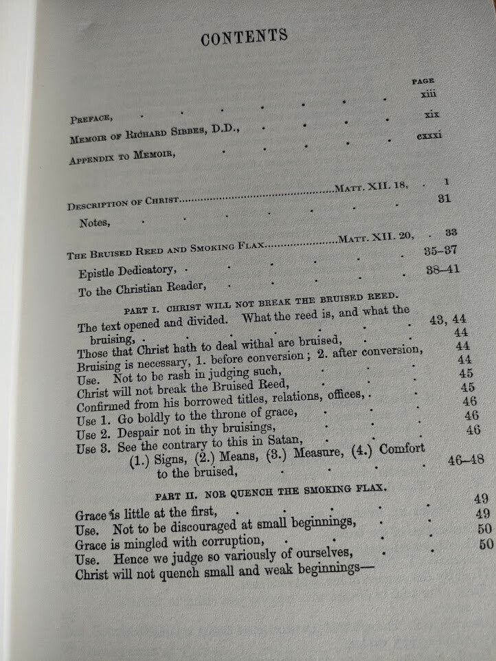 This handsome hardcover volume contains the collected works of Richard Sibbes (1577-1635), one of England's most beloved Puritan preachers and theologians. Published by Banner of Truth, this edition preserves Sibbes' profound spiritual writings that have nourished Christian souls for centuries.