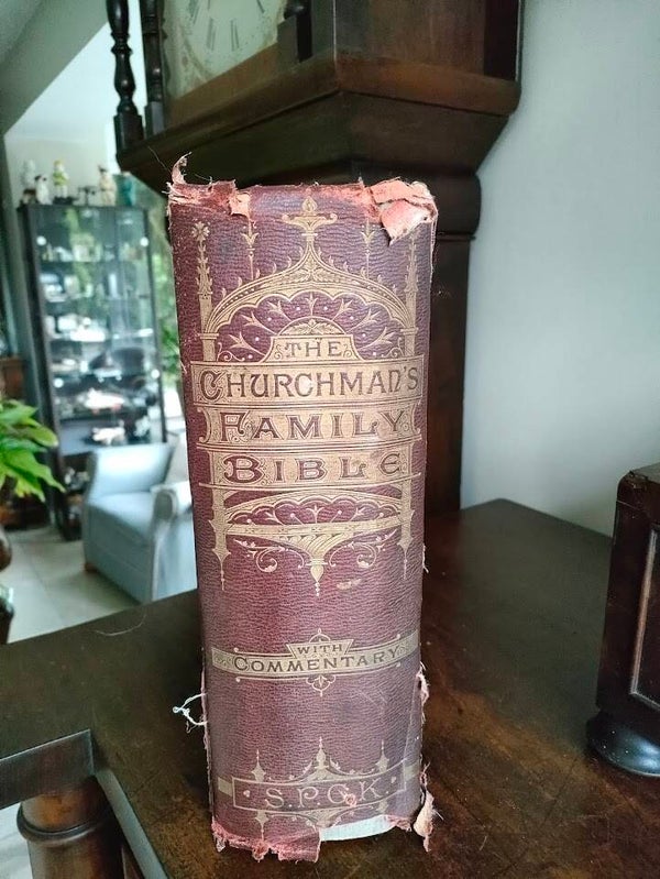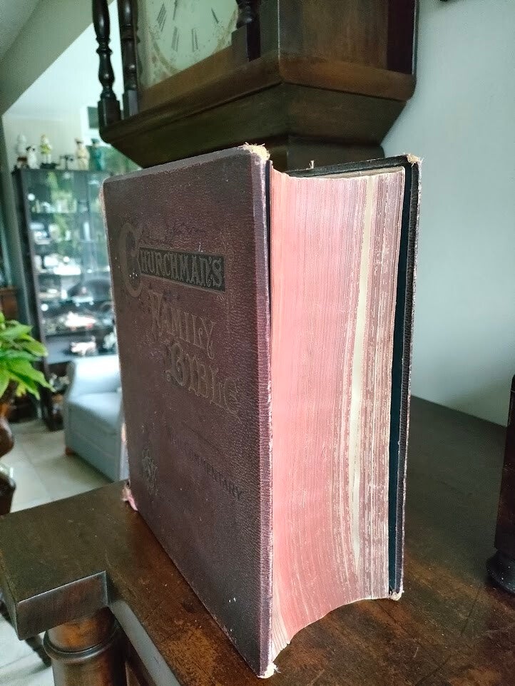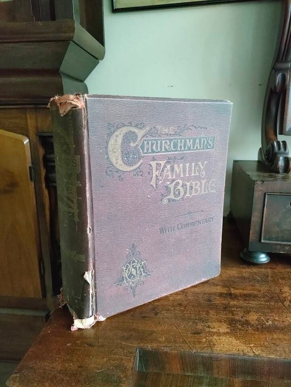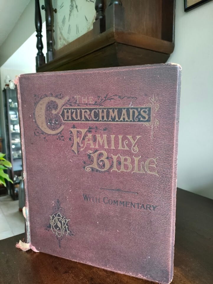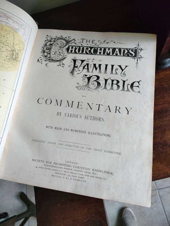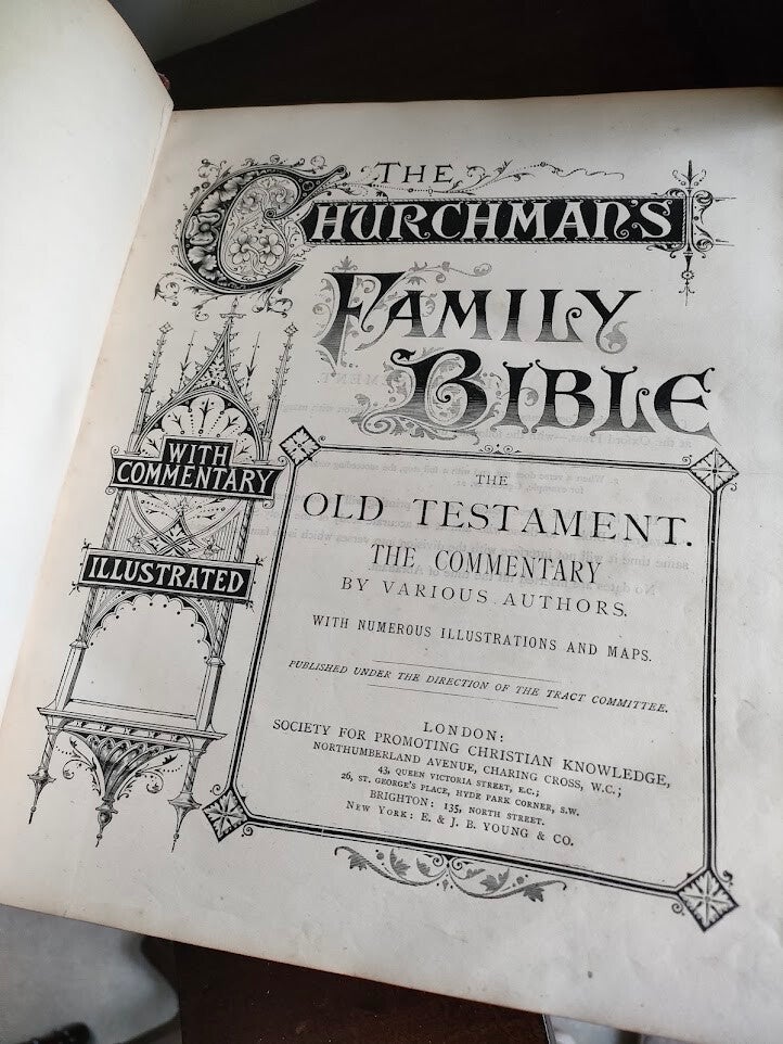 This Victorian-era family Bible is a true collector's piece from the Society for Promoting Christian Knowledge (SPCK) in London. "The Churchman's Family Bible with Commentary" features the work of various biblical scholars and includes maps and numerous illustrations throughout.