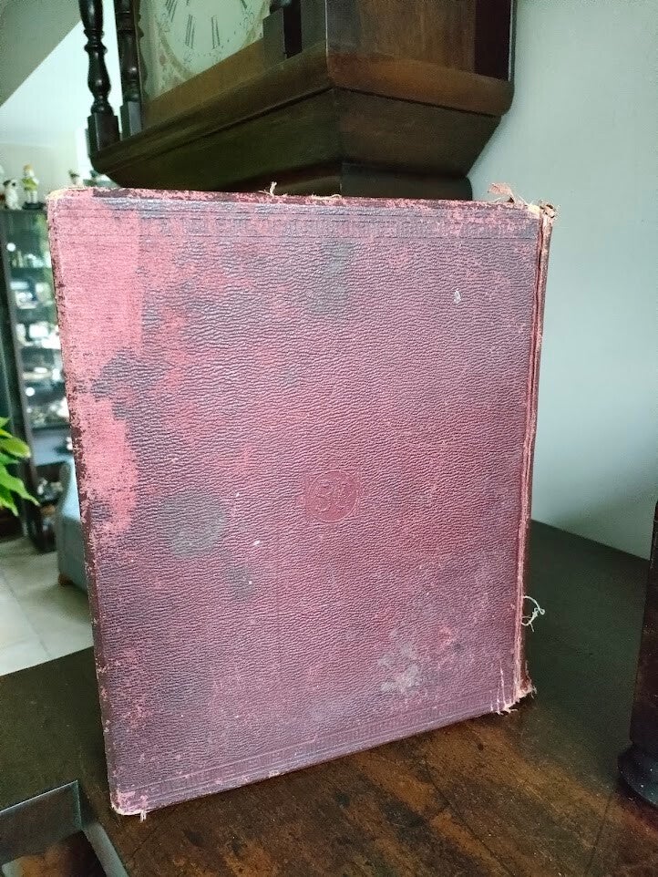 The binding shows period-appropriate wear with some edge fraying and corner damage, consistent with a well-loved family heirloom. All pages appear intact with clear, readable text and illustrations.