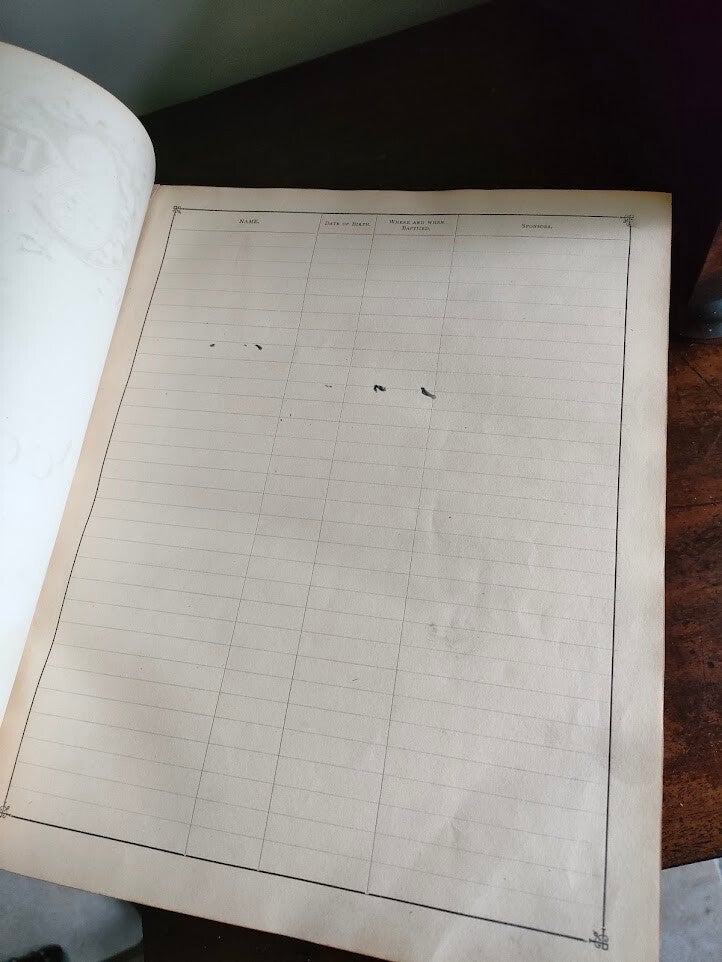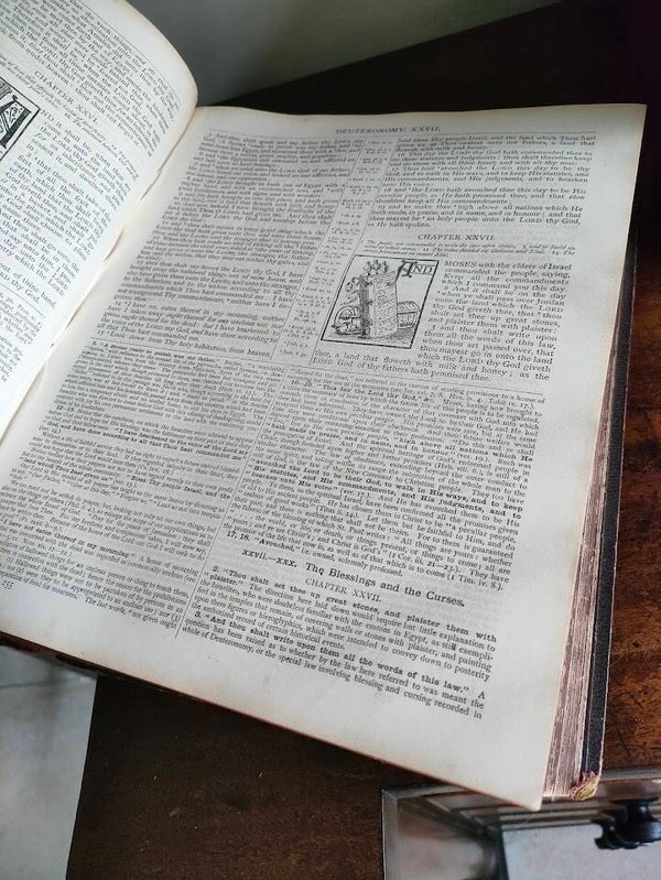 This comprehensive Bible includes detailed commentary, making it both a devotional text and a valuable reference work. The family record pages provide space for genealogical information, making it perfect for family historians or collectors of religious antiquities.